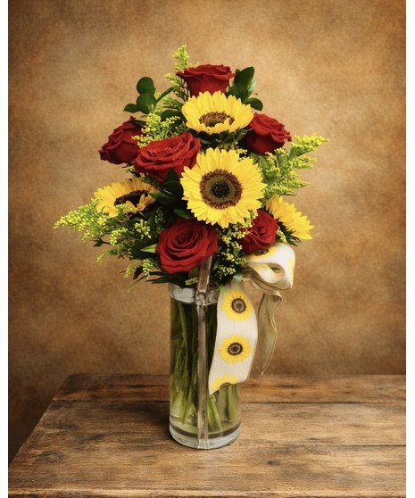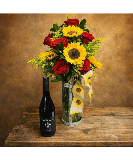 Simply Sunflowers will delight anyone's home or office! This vase includes bright 4 sunflowers, 6 red roses, yellow solidago all stylishly designed in a clear glass vase with metal frame holder with handle. Accented with a sunflower ribbon as well. Upgrade to the PREMIUM version and select either a bottle of red or a bottle of white wine.