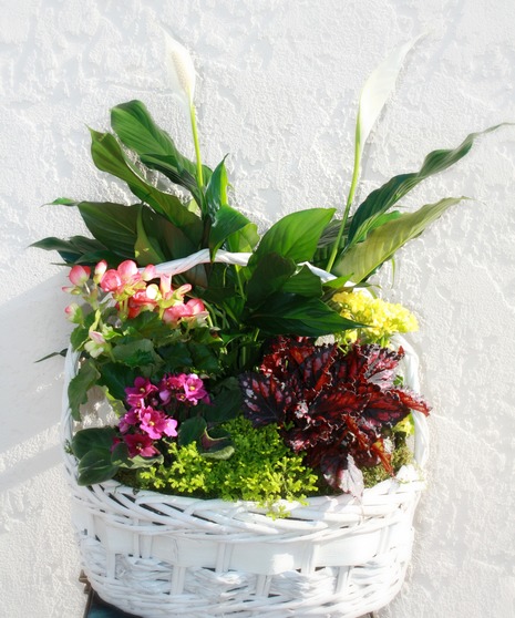 A beautiful assortment of flowering and green plants decorated with a bird and ribbons all designed in a wicker basket.