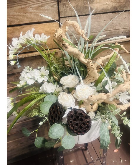 WOW Someone with this stunning classic design of all whites, light grapewood and dried lotus pods. Arrangement includes white freesia, white roses, desert grasses, succulents and eucalyptus for a beachy whimsical desert type feel. All designed in a classic white and gray marble container. Colors and style will match any decor and bring a urban feel sure to strike up conversation.