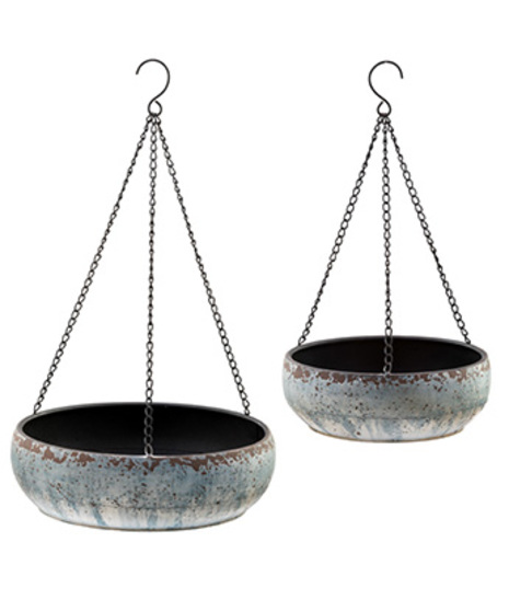 Jazz up your favorite hanging plant with this trendy metal plant holder. Distressed blue and brown tones create an aged look on this matching pair of metal plant hangers. Sold individually.