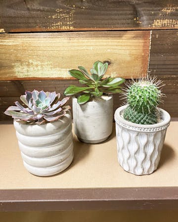 Modern and trendy, this collection of three succulent plants is featured in assorted concrete containers. Each container measures approximately 4" wide by 4.5" high and is filled with assorted succulent styles.