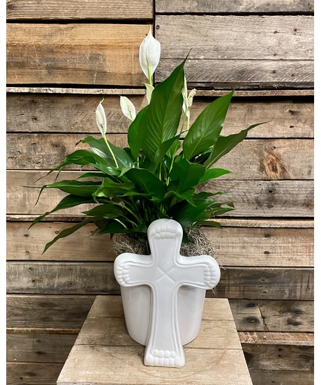 The Thoughts of You arrangement from Port Charlotte Florist is a heartfelt expression of comfort, serenity, and lasting beauty. Designed to embody the peaceful presence that peace lilies are cherished for, this thoughtful gift brings both warmth and elegance to any space. A lush 6-inch Peace Lily plant is displayed inside a white ceramic planter, beautifully accented with a raised cross motif, creating a timeless keepsake that symbolizes faith, love, and remembrance. Finished with a delicate white bow, this piece radiates quiet grace and offers a sense of solace. The Peace Lily, with its glossy green leaves and serene white blooms, is often associated with peace, hope, and renewal, making it an especially meaningful gift during times of loss or reflection. Yet its versatile beauty also makes it a fitting choice for celebrations, housewarmings, baptisms, or to show you care.