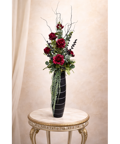 Breathtaking silk decor of realistic red roses in a stunning black vase. Assorted greenery and grasses create a beautiful lush background for the roses. Accented with hanging greenery and standing approximately 44" tall (plus curly willow accent above).