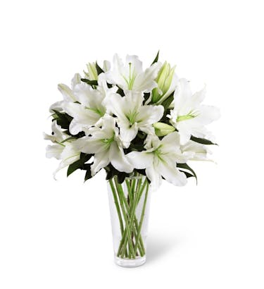 The FTD® Light In Your Honor™ Bouquet is a beautifully bright arrangement bursting with elegant fragrance to convey your deepest sympathies for the loss of their loved one. A stunning bouquet of gorgeous lilies are accented with lush greens and seated in a clear glass vase to create a bouquet that is serenely sophisticated offering comfort and peace in their time of need.