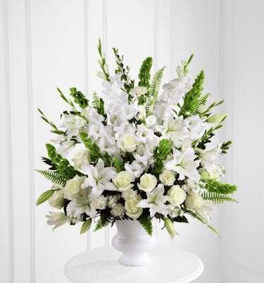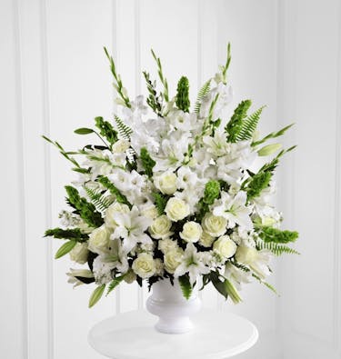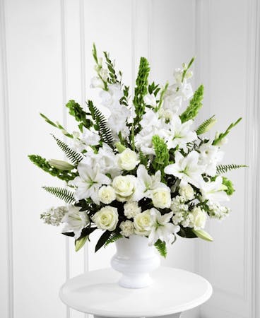 The Morning Stars™ Arrangement is a brilliant expression of peace and soft serenity. Crisp white blooms are accented with the bright green stems of Bells of Ireland and a gorgeous assortment of lush greens, while seated in a designer plastic urn to create a beautiful way to honor the life of the deceased.