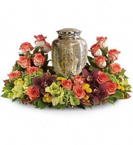 The Sunset Wreath from Port Charlotte Florist is a breathtaking expression of warmth, remembrance, and enduring love. Crafted with great care and artistic detail, this elegant floral arrangement surrounds a cherished urn with natural beauty and heartfelt color. Lush green hydrangea provides a soft and soothing foundation, while vibrant orange roses bring a glow of warmth and peace. Deep, velvety cymbidium orchids add a touch of rich sophistication and depth, symbolizing admiration and strength.